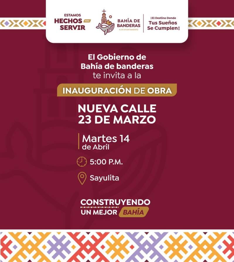 El Gobierno Municipal de Bahía de Banderas invita a la ciudadanía a asistir a la inauguración de la nueva calle 23 de Marzo en la localidad de Sayulita, obra que contribuirá al fortalecimiento de la infraestructura, así como a mejorar la seguridad y la movilidad tanto de locales como de visitantes.